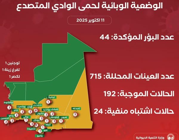 ارتفعت بؤر حمى الوادي المتصدع في موريتانيا إلى 44 بؤرة موزعة على22 مقاطعة تتبع لعشر ولايات.