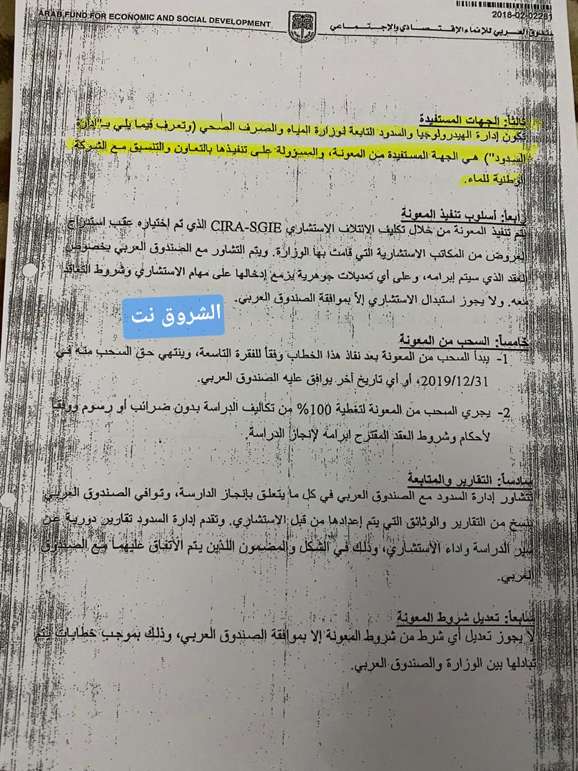 وقد أشترط في هذا الخطاب أن تكون الجهة المستفيدة هي الإدارة التي كان يديرها في تلك الفترة السيد أحمد زيدان وهي إدارة الهيدرولوجيا والسدود التابعة لوزارة المياه والصرف وتكون كذلك المسؤولة عن تنفيذها.