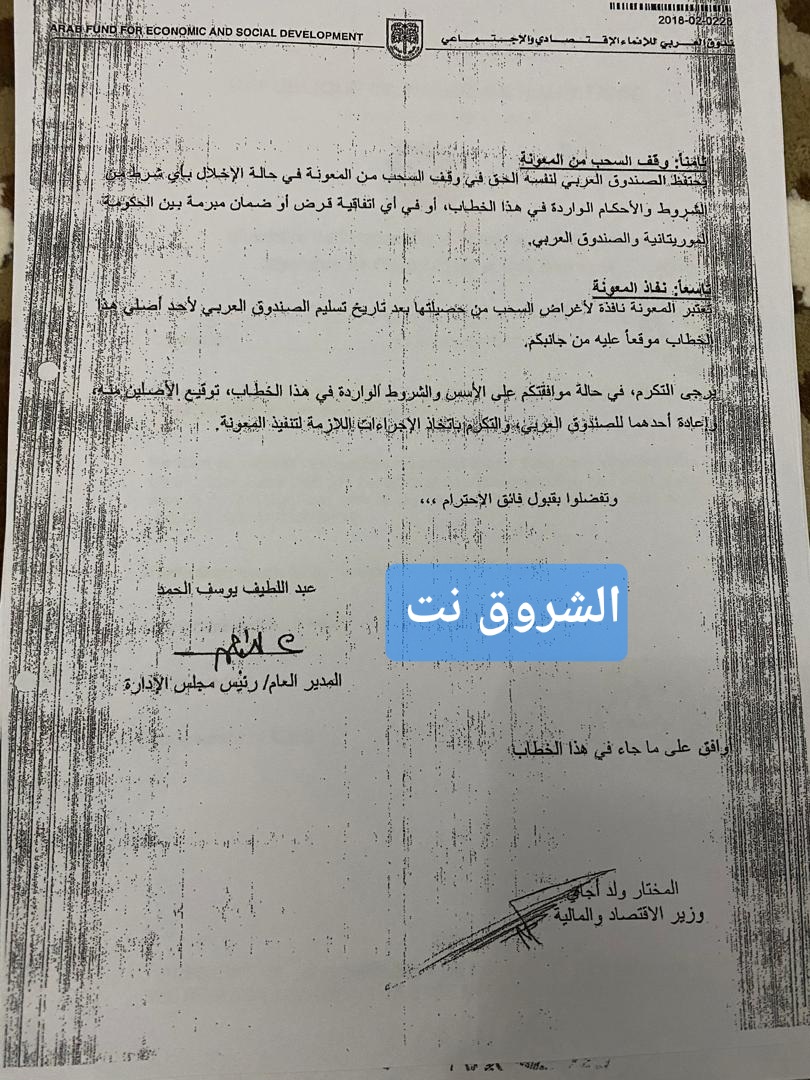 بدأ ذلك من توقيع خطاب التفاهم بخصوص المعونة التي منحها الصندوق العربي للإنماء الاقتصادي والاجتماعي للحكومة الموريتانية في 2018 والموقعة من رئيس الصندوق العربي ووزير الإقتصاد والمالية أنذاك، الوزير الأول حاليا، السيد المخطار ولد أجاي.
