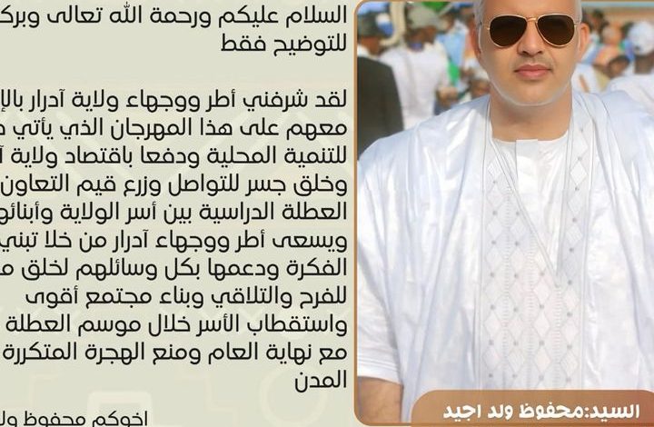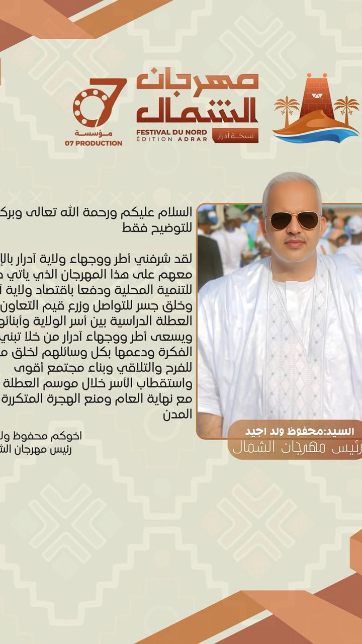 يشرفنا ويسعدنا أن نتقدم بدعوة رسمية وعامة إلى كافة المواطنين، وإلى ساكنة الشمال عمومًا وساكنة ولاية آدرار خصوصًا، من أجل الحضور والمشاركة الفاعلة في المهرجان الكبير الذي ستحتضن مدينة أطار النسخة الأولى بتاريخ 31 ديسمبر