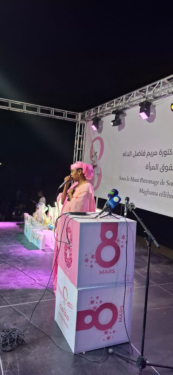 من جهتها، ألقت رئيسة التظاهرة السيدة هاوا جالو أبو موسى، المديرة العامة للمكتب الوطني للسياحة ونائبة رئيس حزب الإنصاف الحاكم، كلمة بالمناسبة ثمنت فيها المكاسب التي حققتها المرأة الموريتانية خلال السنوات الأخيرة، موكدة أن هذه المكاسب تعززت بشكل ملحوظ في عهد فخامة رئيس الجمهورية السيد محمد ولد الشيخ الغزواني، الذي جعل من تمكين المرأة وترقية حقوقها أحد المحاور الأساسية في سياساته التنموية.